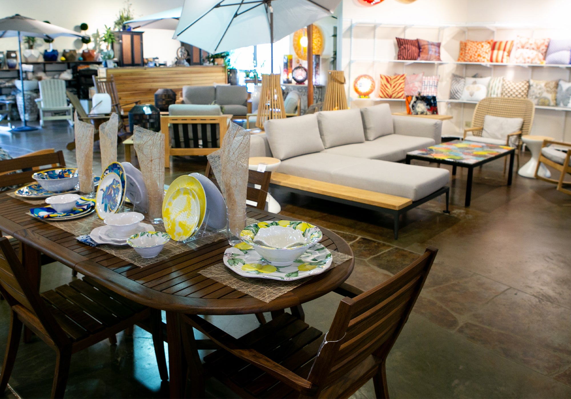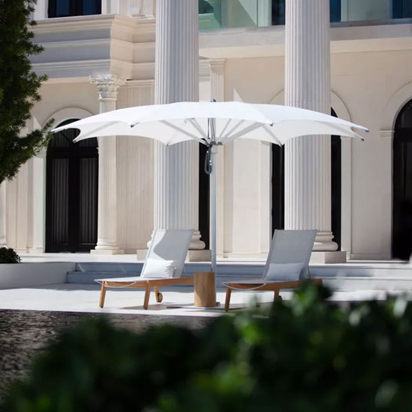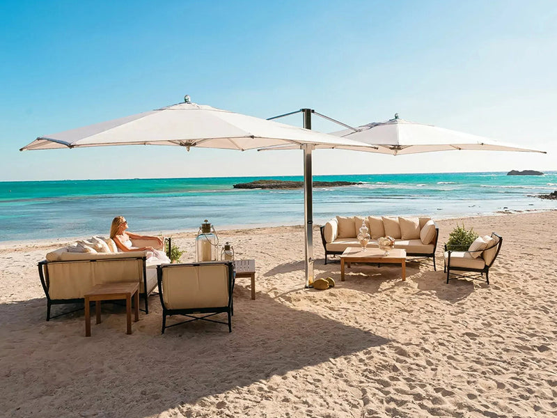 Complete your outdoor space with premium cantilever umbrellas from TUUCI, Treasure Garden, and Shademaker, along with refined accents like Elaine Smith outdoor pillows.